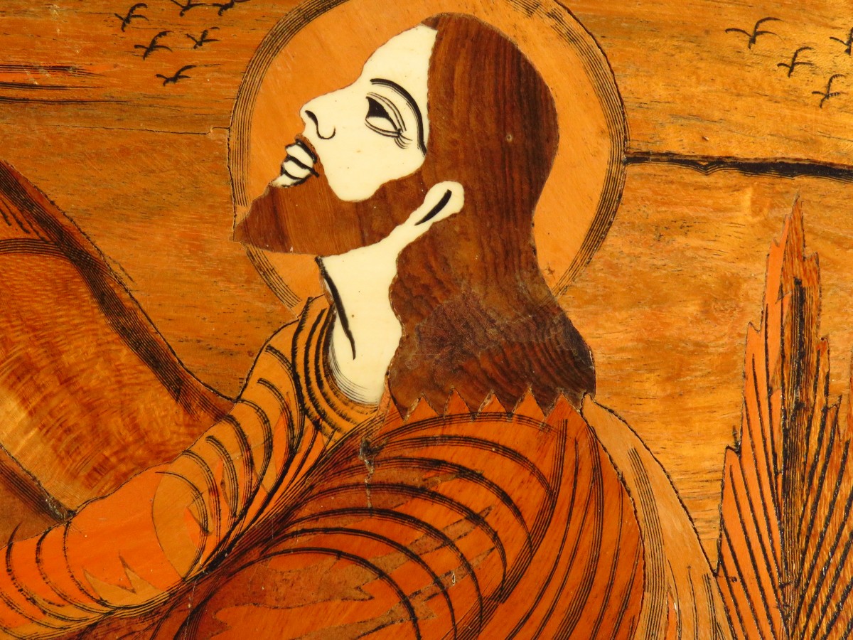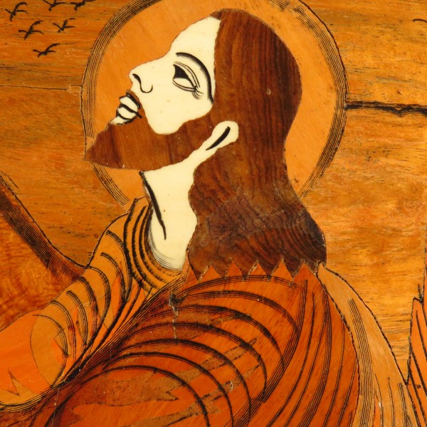A wooden work of Jesus prays.