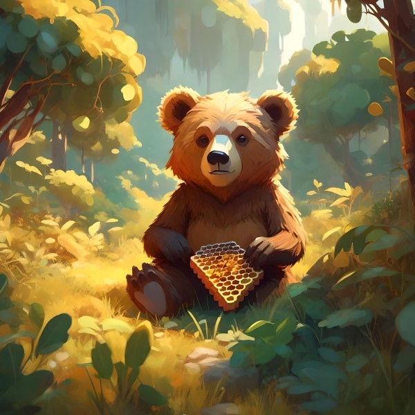 A cute baby bear sitting and enjoying honey. Baby bear in the jungle scene.