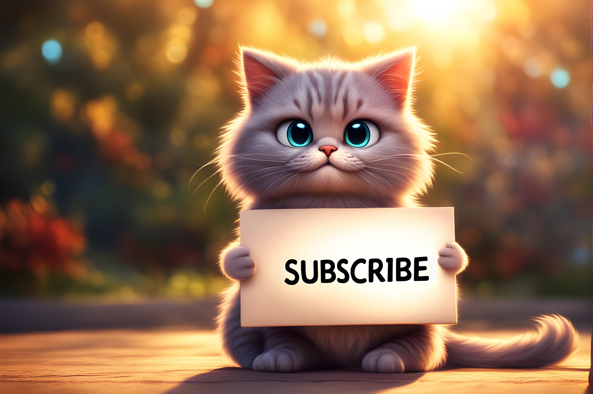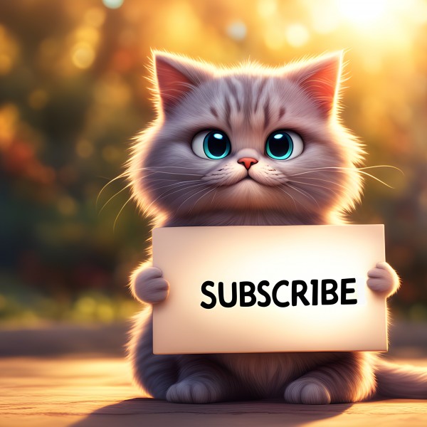 A fluffy cat holding a signboard says subscribe.