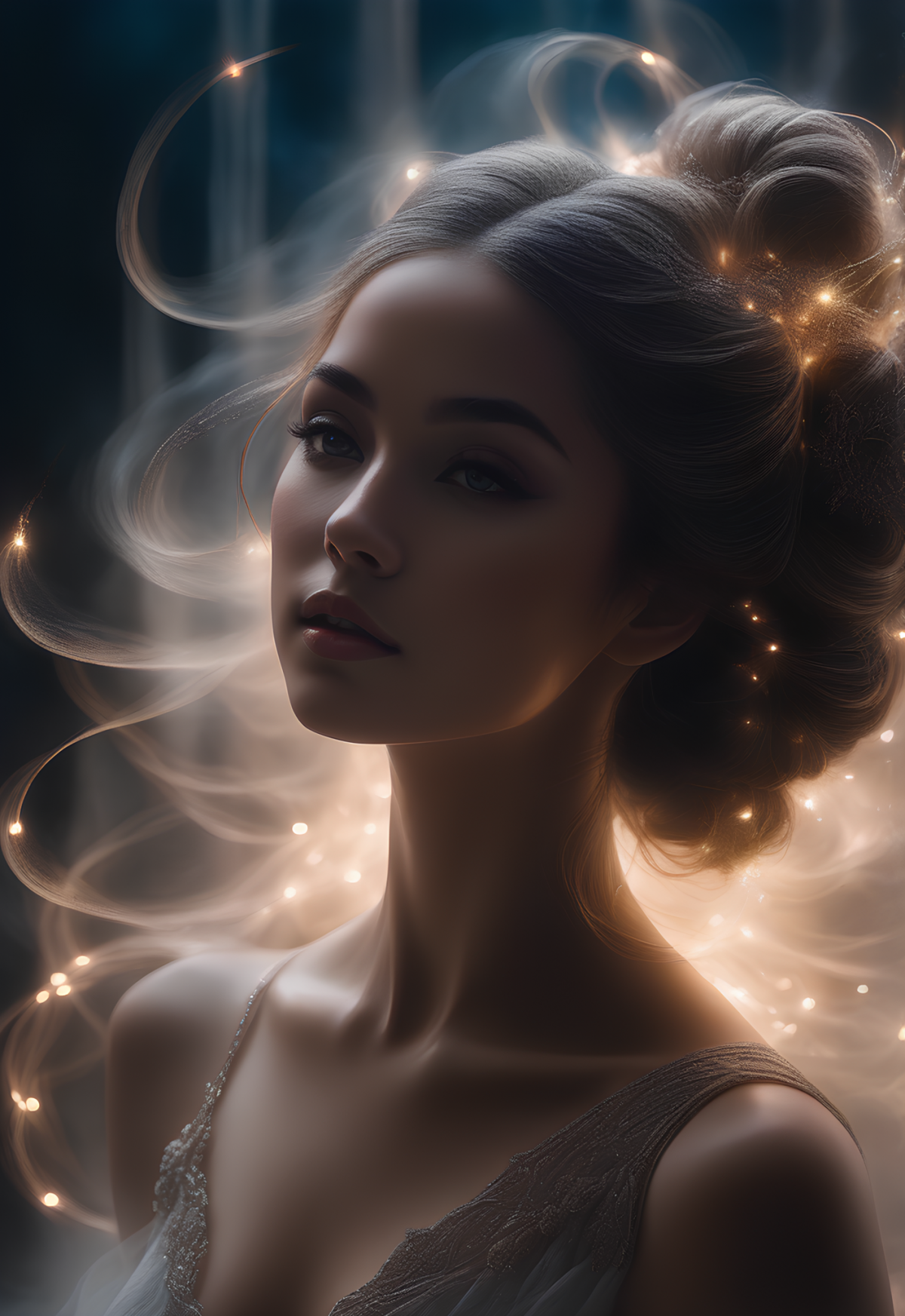 Portrait image of a gorgeous lady smoke background.