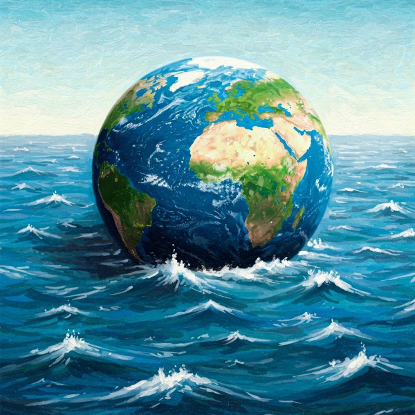 Sinking Truths: The World on the Edge. The planet floats on rising seas—a stark warning of climate change and melting polar ice.